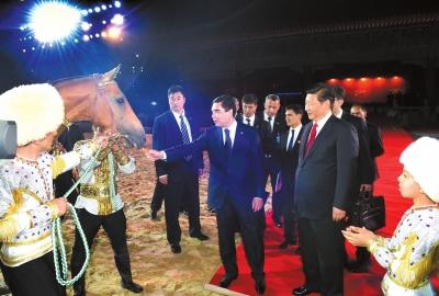 当晚,习近平与别尔德穆哈梅多夫从人民大会堂移步至劳动人民文化宫,正是在这里,习近平接受别尔德穆哈梅多夫代表土方赠与中方的一匹汗血马。
