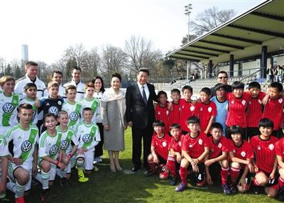 习近平访德时,看望在德国训练的中国少年足球运动员。