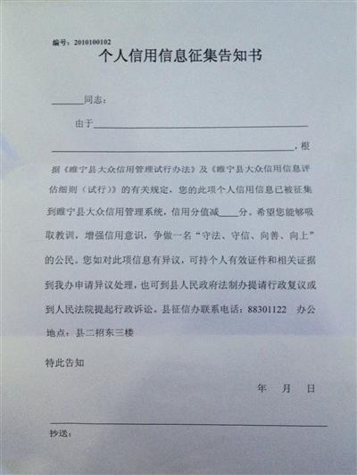 睢宁县称,征信办设置了征信通知个人的环节,但实际操作中,对被加减分的个人,“未全部通知”。