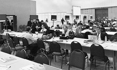 各国媒体工作人员在新闻中心紧张忙碌地工作。本报记者 丁 刚摄