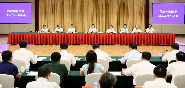 中共中央政治局委员、中央政法委书记孟建柱15日在司法体制改革试点工作座谈会上强调,深刻认识深化司法体制改革的重要性、紧迫性,进一步把思想和行动统一到习近平总书记系列重要讲话精神和中央关于深化司法体制改革的决策部署上来,牢固树立改革大局观,把注重顶层设计与鼓励基层探索结合好,凝聚共识、攻坚克难,扎实推进司法体制改革,走出一条具有中国社会主义特色、符合司法规律的改革之路。