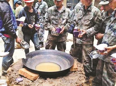 教师熊金华的女友杨云翠是当天的煮饭者之一。“看官兵们太辛苦了,我们着急,只能烧开水泡面,就用学校食堂的锅搭了两个临时灶台。方便面有官兵自带的,也有我们学校的。我担心水不干净,还特意往锅里加了很多生姜。学校里有些白菜,本来我切了要炒,看到大家太饿了,顾不上,也直接放水里煮了。”