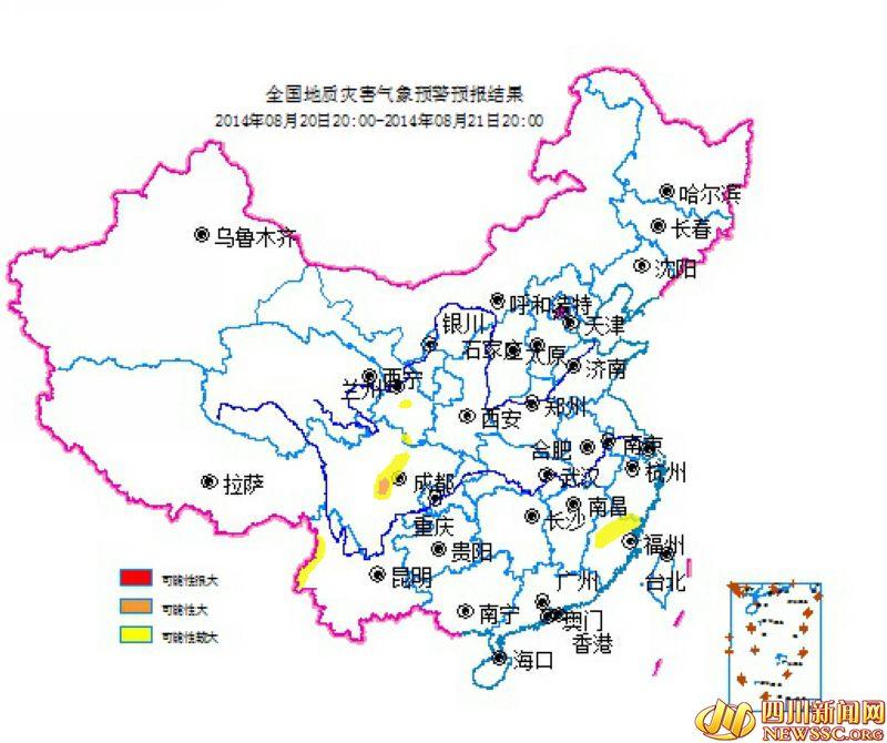 今日,四川新闻网记者从国土资源部获悉,2014年8月21日20时至22日20时,四川中部局部地区发生地质灾害的可能性大(橙色预警)。四川中部、西部局部、云南西部局部、西藏东部局部地区发生地质灾害的可能性较大(黄色预警)。(记者 何雪)