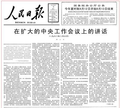 例如,1987年所载的《在扩大的中央工作会议上的讲话》一文,是1962年6月2日邓小平在“七千人大会”上的讲话。中共中央文献研究室在二十多年后重新在人民日报上刊发此文,是为了重申党的建设方面的问题。这篇讲话论述了坚持党的优良传统的重要意义,透彻地阐明了民主集中制的原则,指出民主集中制是党和国家的根本制度,是关系党和国家命运的事情,要在全党恢复和坚持民主集中制。