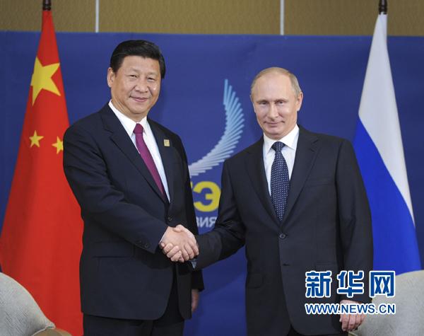 普京表示,很高兴今天同习近平主席见面,就两国关系未来发展交换意见。当前,俄中关系发展很好,双方领导人交往频繁,经贸、两军、人文等领域交往合作不断加 强,在重大国际和地区问题上有效协作。俄方高兴地看到,俄罗斯中国旅游年活动丰富多彩。展望未来,俄中关系发展前景广阔。我愿同习近平主席继续保持亲密友 谊和密切交往,进一步推动各领域务实合作,实施好能源、基础设施建设等重大合作项目,加强在国际事务中的沟通和协调。