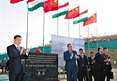 13日,习近平和塔总统拉赫蒙共同出席中国-中亚天然气管道D线塔吉克斯坦境内段开工仪式。 新华社记者 黄敬文 摄