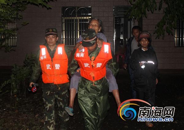 同时,三江镇地势较低的梅坡村在暴雨中完全被淹,100余名村民被困,灾情刻不容缓。武警海口市支队派出100余名官兵涉水步入村庄迅速转移群众。官兵们把绳索系在身上,不断地在黑夜里呼喊:“有没有人,我们来救你们了!”官兵们挨家挨户进行搜索,进入被淹民房将灾民背出转移至安全地带。截止记者发稿时,120余名群众已全部被安全转移。