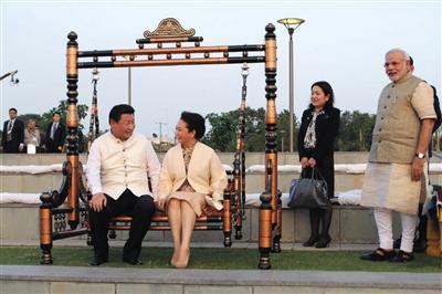 9月17日,印度古吉拉特邦,习近平和彭丽媛一起荡秋千。