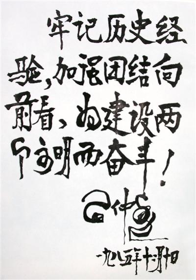 1985年12月10日,回到北京的习老,专门为洛耐题词:“牢记历史经验,加强团结向前看,为建设两个文明而奋斗!”