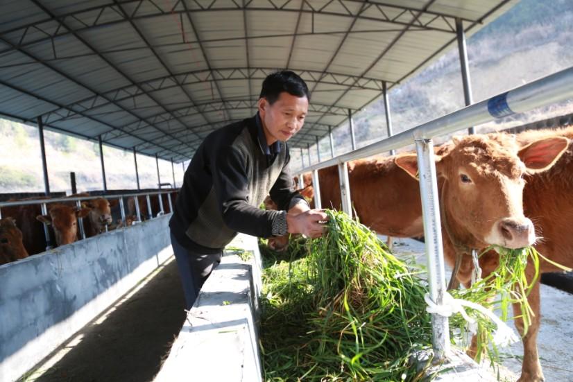 湘西花垣县德农牧业采取委托扶贫的方式,帮助村民发展黄牛产业。图为十八洞村民施管保正在给黄牛喂草(明星/摄)