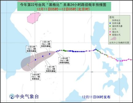 预计,“黑格比”将以每小时20公里左右的速度向西偏南方向移动,强度缓慢减弱。中央气象台12月11日06时继续发布台风蓝色预警。