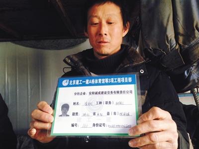 昨日下午,李永平拿着儿子的工卡。当日上午,其子在清华附中工地倒塌事故中身亡。(记者 浦峰 尹亚飞 周岗峰 摄)