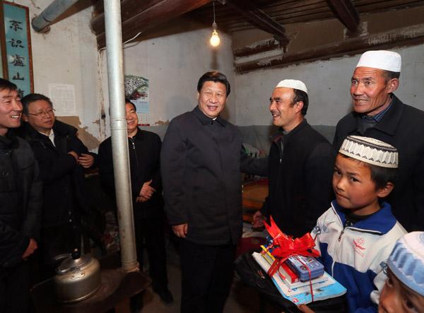 2013年2月3日,习近平来到甘肃省东乡族自治县布愣沟村困难群众马麦志家中看望,并给马麦志的两个儿子带来了学习用品。
