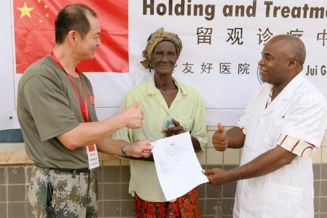 (1月19日,在塞拉利昂弗里敦,中塞双方医务人员为痊愈出院的75岁老人塔拉瓦利(中)颁发康复证书。)