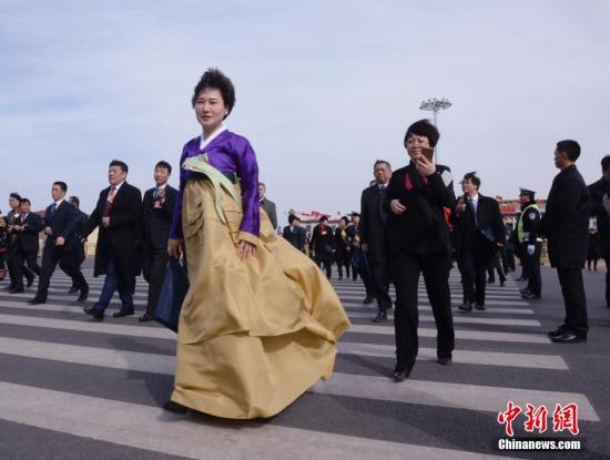 3月8日,第十二届全国人民代表大会第三次会议举行第二次全体会议,听取全国人大常委会委员长张德江关于全国人民代表大会常务委员会工作的报告,听取全国人大常委会副委员长李建国关于中华人民共和国立法法修正案草案的说明。一名朝鲜族女性全国人大代表步入会场。 中新社发 侯宇 摄