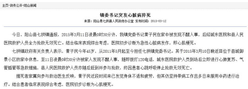 2015年3月12日,阳山县政府发布消息称,12日,阳山县七拱镇通报,2015年3月11日凌晨0时30分许,七拱镇党委书记黄子民在家中被发现不醒人事,后经城东医院和县人民医院救护人员全力抢救无效死亡。结合临床表现综合考虑,医院初步诊断为急性心脏病发作,即心肌梗死。