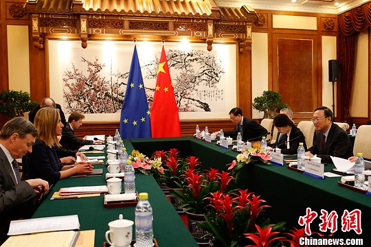 5月5日,中国国务委员杨洁篪同来华的欧盟外交与安全政策高级代表兼欧盟委员会副主席费代丽卡·莫盖里尼举行第五轮中欧高级别战略对话。中新社发 韩海丹 摄