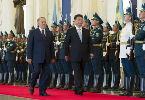 9月7日,习近平在阿斯塔纳同哈萨克斯坦总统纳扎尔巴耶夫举行会谈。会谈前,纳扎尔巴耶夫在总统府为习近平举行隆重欢迎仪式。两国元首登上检阅台。军乐队奏中哈两国国歌。习近平在纳扎尔巴耶夫陪同下检阅仪仗队。