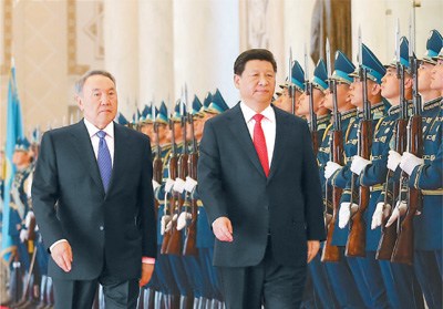 习近平主席访问哈萨克斯坦,马西莫夫总理亲赴机场迎接;纳扎尔巴耶夫总统举行隆重欢迎仪式,共同检阅三军仪仗队。纳扎尔巴耶夫总统很是感激老朋友的情谊:“我们的心更为接近。哈萨克斯坦永远对中国友好。”