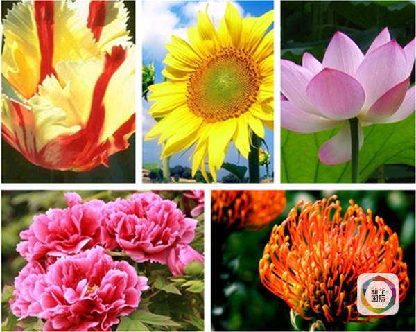 金砖国家5国的国花: 巴西的毛蟹爪莲、 俄罗斯的向日葵、 印度的荷花、 中国的牡丹和南非的蒂王花。