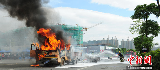 中新网云浮7月9日电(黄耀辉 周洲)以保障广东至大西南交通枢纽安全畅通的演习,9日上午在国道G324线广东大西关云浮市境内上演,一辆满载易燃易爆液体货车液体泄漏燃烧,事故造成现场有人受伤,云浮市启动公路突发事件Ⅳ应急预案。