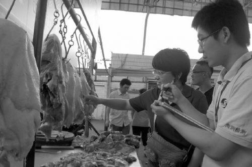检查人员对市场销售的肉菜等进行抽检。本报记者 吕璐 摄