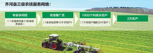 在齐河县,像赵金诚这样的“科技示范户”,数量已经达到1000名。向下,每个“科技示范户”辐射带动20个农户;向上,每10个“科技示范户”由1名从县乡两级农技推广人员中择优选派的技术指导员联系;再向上,全县精心选聘一名首席专家、12名具有高级职称的农技人员组成“专家讲师团”,负责全县农业技术指导。就这样,“县有技术专家、乡有技术指导员、村有科技示范户”的三级农技服务网络得以形成。