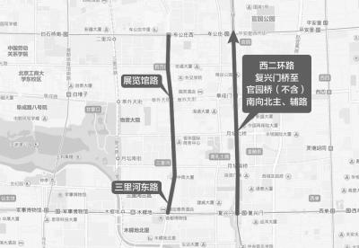 9月3日10时50分至活动结束,西二环路由复兴门桥至官园桥(不含)南向北主、辅路;三里河东路;展览馆路由三里河东路路口至车公庄大街路口,除持有纪念大会专用证件的车辆和人员外,禁止其他车辆和行人通行。(图⑨)