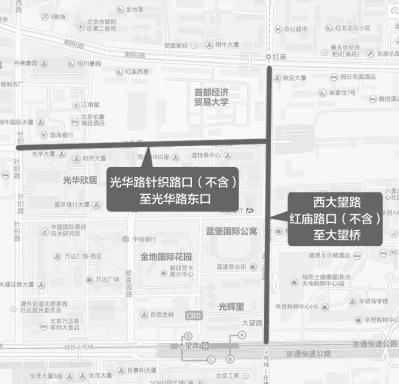 9月2日19时30分至9月3日21时,西大望路由红庙路口(不含)至大望桥(不含),光华路由针织路口(不含)至光华路东口,除持有纪念大会专用证件的车辆和人员外,禁止其他车辆和行人通行。(图②)
