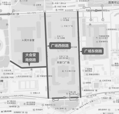 9月2日5时43分至活动结束,广场东、西侧路,大会堂南侧路,除持有纪念大会专用证件的车辆和人员外,禁止其他车辆和行人通行,9月2日5时43分至12时,允许公交车通行。(图③)