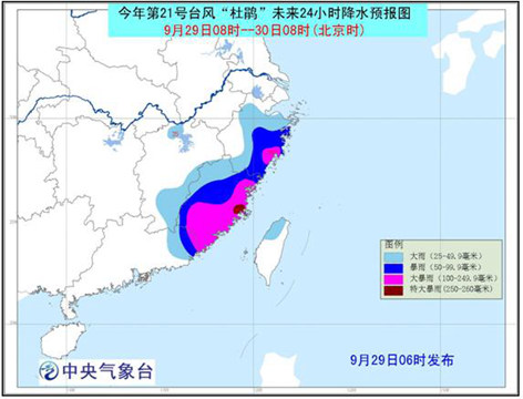 29日08时至30日08时,浙江东部和南部、福建、广东东北部、江西东南部和北部、台湾西北部等地有大雨或暴雨,其中,浙江东部沿海、福建东部和南部有大暴雨(100-180毫米),福建沿海局部地区有特大暴雨(250-260毫米)。