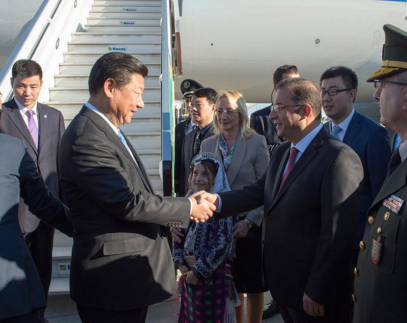 图为:2015年11月14日,国家主席习近平抵达土耳其安塔利亚,应土耳其共和国总统埃尔多安邀请,出席二十国集团领导人第十次峰会。土耳其高级官员到机场迎接习近平主席一行。