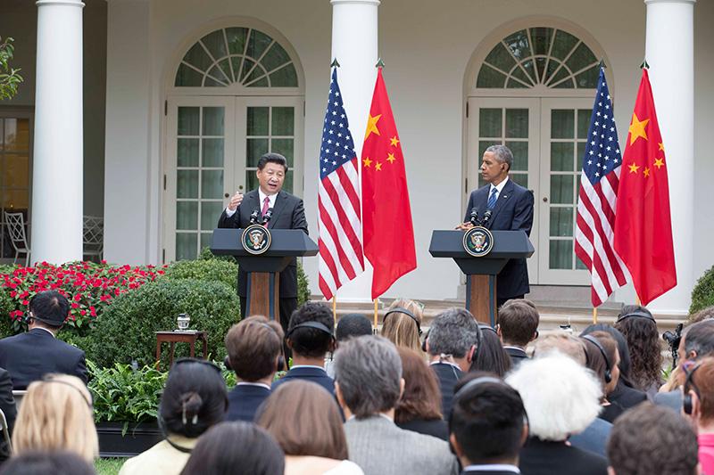图为:2015年9月25日,国家主席习近平在华盛顿同美国总统奥巴马举行会谈。会谈后,两国元首共同会见记者。