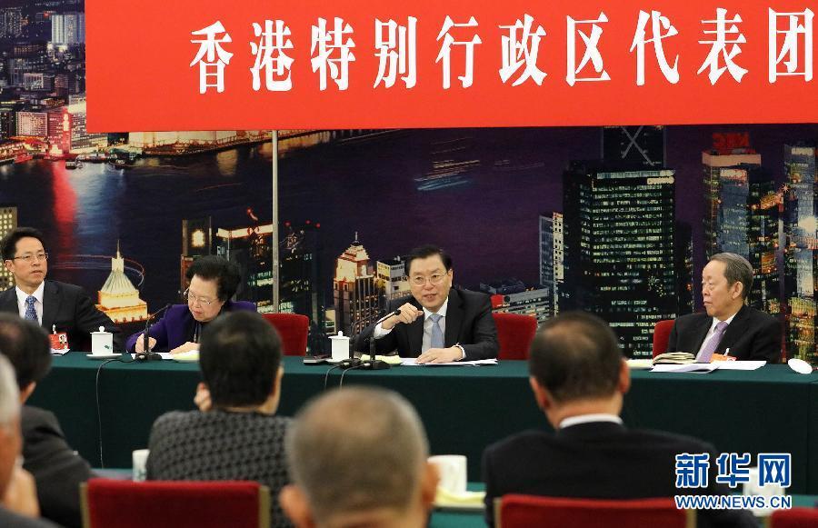 3月6日,中共中央政治局常委、全国人大常委会委员长张德江参加十二届全国人大四次会议香港代表团的审议。新华社记者 刘卫兵 摄