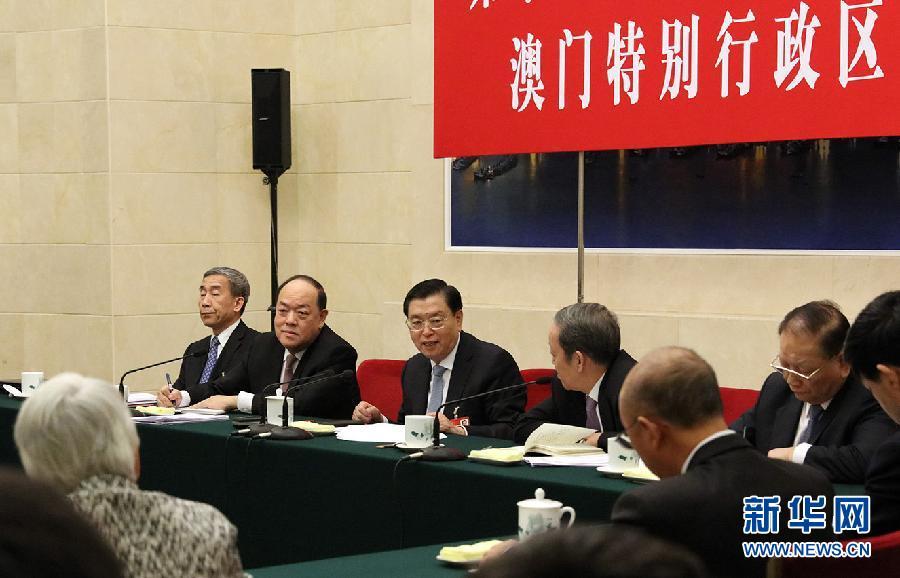 3月6日,中共中央政治局常委、全国人大常委会委员长张德江参加十二届全国人大四次会议澳门代表团的审议。新华社记者 刘卫兵 摄