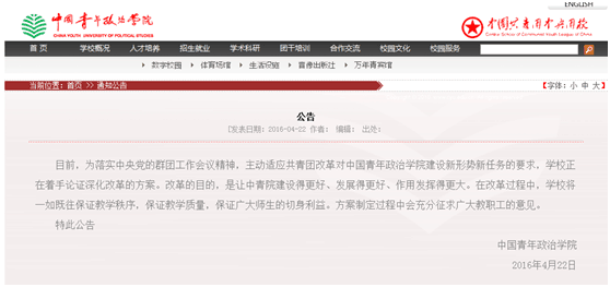 中国青年政治学院公告:正着手论证深化改革方案