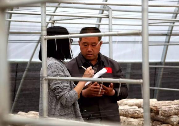 网媒记者在南栗园铺村食用菌生产大棚采访。