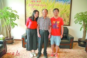 本报记者与袁隆平合影。