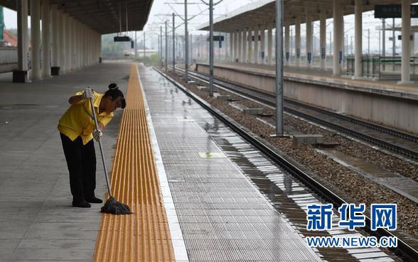 8月2日,在广西梧州南火车站,一名清洁工人在空无旅客和列车的站台上打扫卫生。当日,受台风“妮妲”影响,南广铁路除D3564/7次外所有动车停运,贵广客专开往广州方向的动车除南宁东至贺州6列动车外全部停运,14列途经南宁铁路局管内或始发普速旅客列车停运。 新华社记者 陆波岸 摄