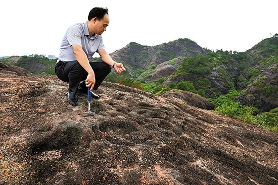 河源恐龙博物馆馆长杜衍礼双脚站在恐龙足印上 羊城晚报记者 王磊 摄