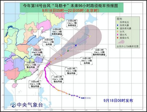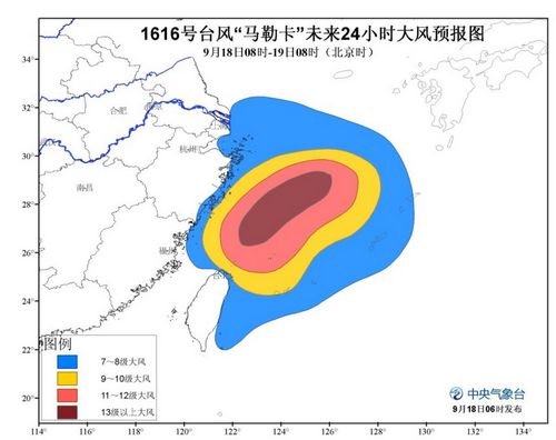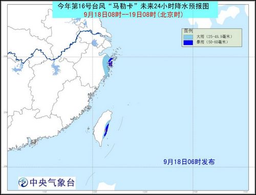 大风预报:9月18日08时至19日08时,黄海南部、杭州湾、长江口区、浙江沿海、福建北部沿海、东海大部、台湾以东洋面、台湾海峡东北部、台湾东部和北部沿海将有7~9级大风,部分海域风力有10~12级,“马勒卡”中心经过的附近海域风力可达13~14级,阵风15级。
