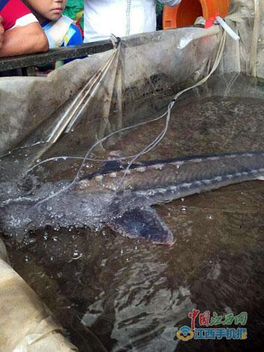 据悉,当日一大早,陶友莲赶到抚河岸边,将前一天放的渔网拉上来,竟然有一条“大家伙”。“我今年70岁,从来没有见过这样的鱼。”陶友莲说,该鱼1米多长,有尖尖的脑袋、修长的身躯,嘴角还有4根须。上大学的孙子小陶觉得眼熟,上网一查,发现很像中华鲟,遂报警。民警赶到现场后,通知了渔政人员。