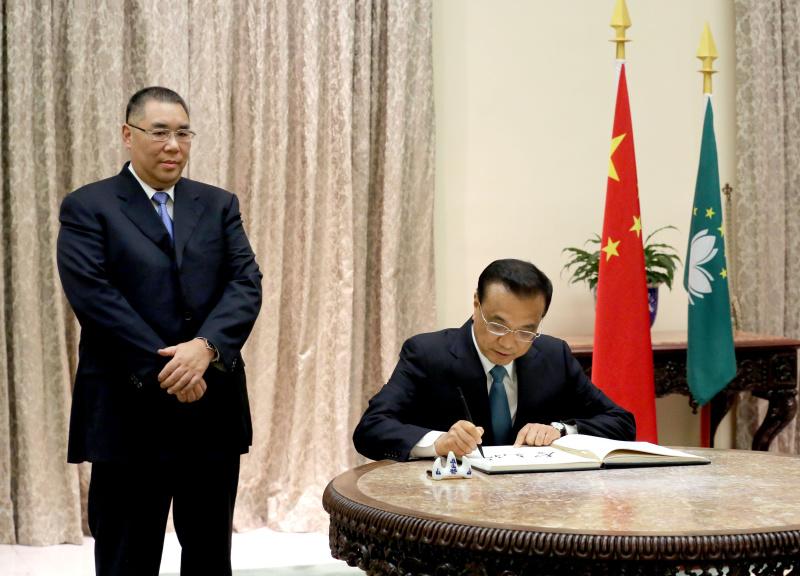 李克强总理10日下午视察澳门特区政府总部,与特区政府主要官员合影,并在嘉宾签名册上签名。在听取崔世安行政长官及特区政府5位司长的工作汇报后,李克强作了重要讲话。他说,中央政府最近根据新形势下澳门发展的新需求,提出了多项惠澳政策。