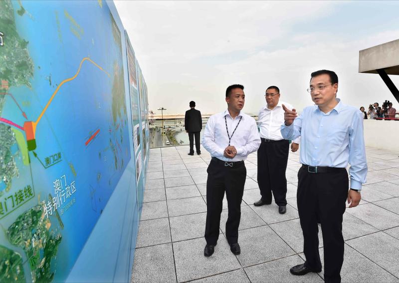 李克强总理11日在澳门视察建设中的港珠澳大桥。该桥总长55公里,预计2017年底竣工,为世界最长跨海大桥。2009年,时任国务院副总理的李克强在珠海主持大桥动工仪式,并眺望澳门。如今首次踏足澳门,他专程前往视察建设进度。大桥建成后,港澳将与内地更深融合。