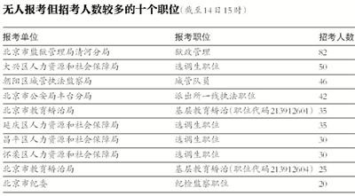 截至14日15时,北京公务员招考的2136个职位中,仍有1939个职位无人报考,占全部职位的90%。