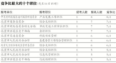 截止到14日15时,竞争比最高的职位为中关村科技园区通州园管理委员会的产业发展工作职位,招录1人,学历要求为本科及以上,两年以上(含两年)基层工作经历。目前报考该职位报名并通过审查的有8人。