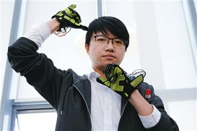 11月4日,乌镇互联网产业园,工作人员在展示一款“手语发声器”。这款布满电子感应装置的手套可感知手语手势,再通过手机进行语音播放。
