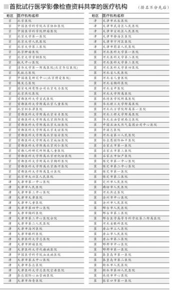 首批试行医学影像检查资料共享的医疗机构共102家,其中北京市31家、天津市26家、河北省45家。首批试行医学影像检查资料共享的项目共17项,包括7项常规医用X射线摄影、5项X线计算机断层摄影装置(CT)检查项目和5项核磁共振成像( MRI)检查项目,均为医学影像学科最为常用、易于标准化且有一定地方共享工作基础的检查项目。