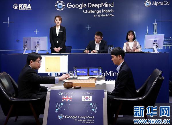 资料图:这是2016年3月15日,韩国棋手李世石九段(前右)在韩国首尔与“阿尔法围棋”的第五场对弈中。 新华社发
