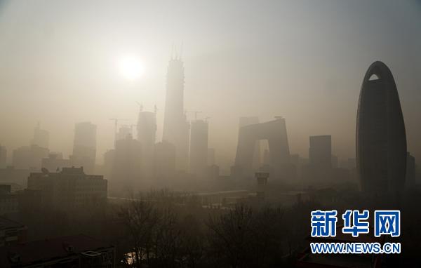 资料图:这是雾霾笼罩的北京东三环地区的楼群(1月3日摄)。 1月3日,北京持续重度雾霾天气。 新华社记者李欣摄